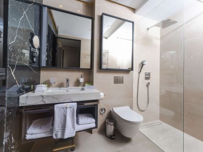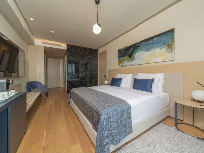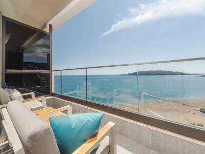 Apartman ima pogled na more, dvije odvojene spavaće sobe sa francuskim ležajem (200x200cm) i dva kupatila. Izuzetno prostran, šik apartman u modernom i elegantnom stilu, sa panoramskim prozorima i namještenim privatnim balkonom, pruža zadivljujući pogled na veličanstveni Jadran i ostrvo Sveti Nikola.